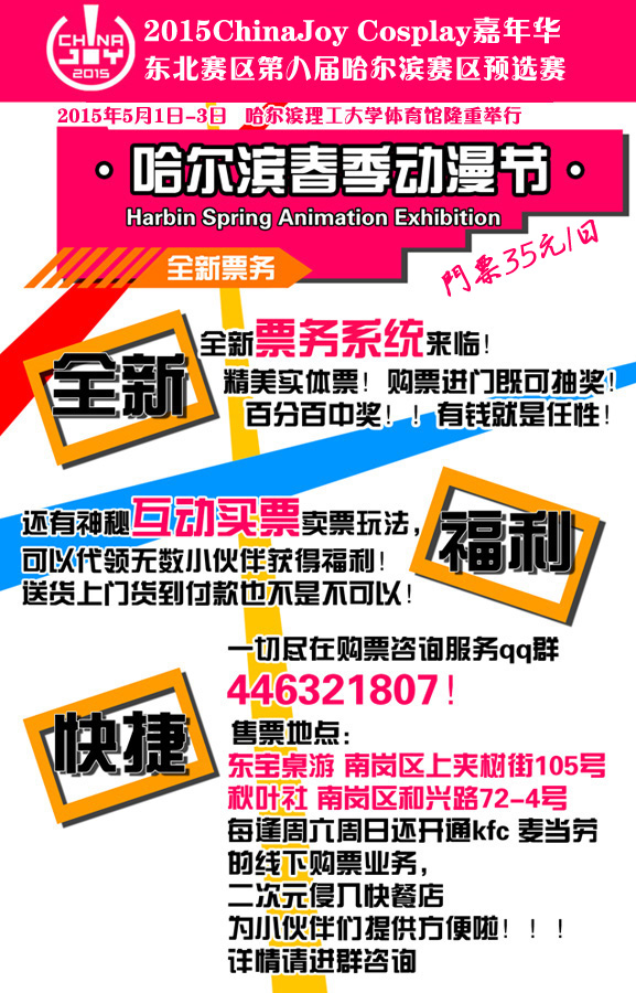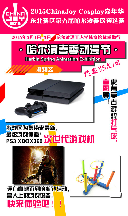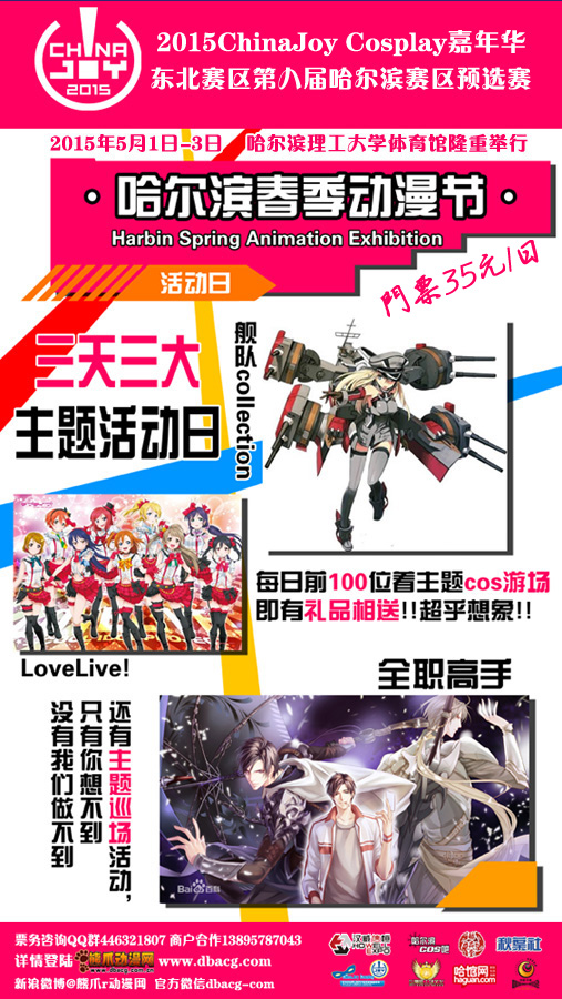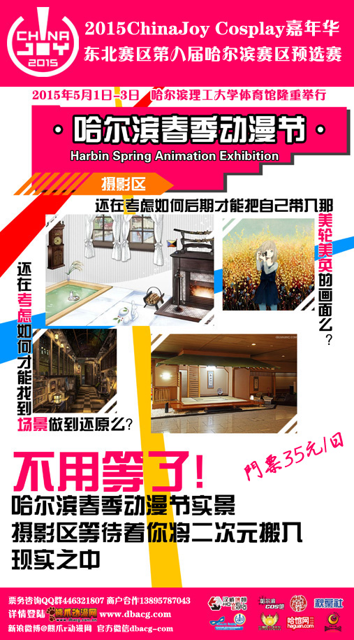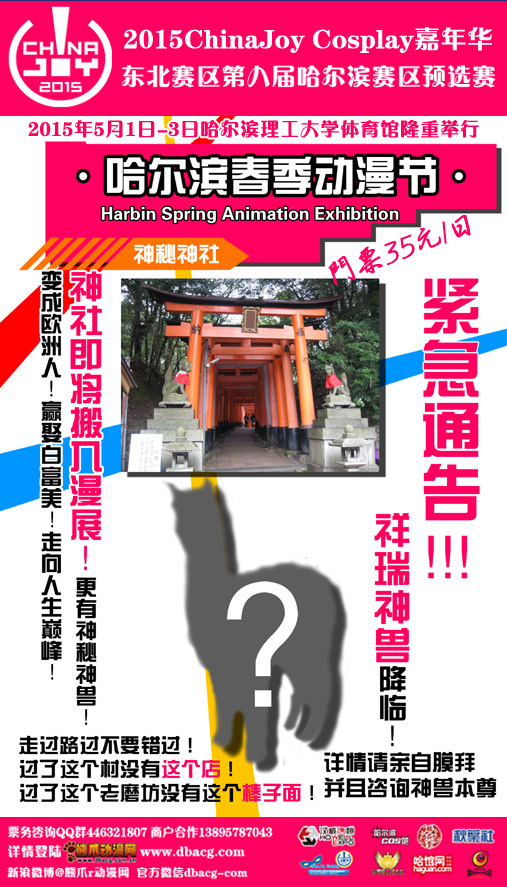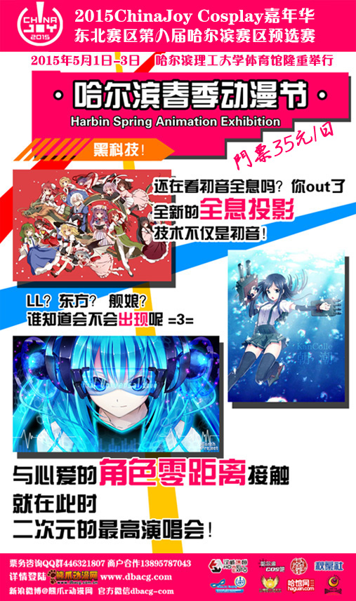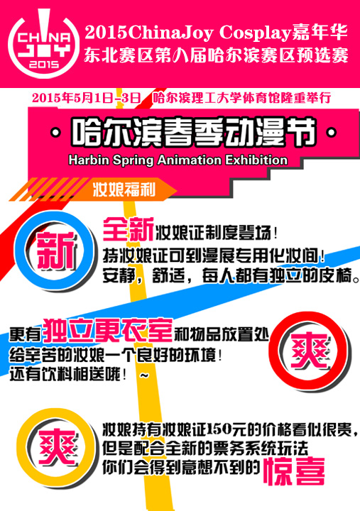 一年一度黑龙江动漫爱好者们的盛会2015ChinaJoy COSPLAY嘉年华东北赛区第八届哈尔滨赛区预选赛将于5月1日至5月3日在哈尔滨理工大学体院馆举行。