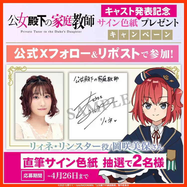 2025年7月即将播出的电视动画《公女殿下的家庭教师》中,冈咲美保将出演莉恩一角。这部动画是关于拥有罕见魔法技术的青年阿伦,担任无法使用魔法的公女蒂娜的家庭教师...