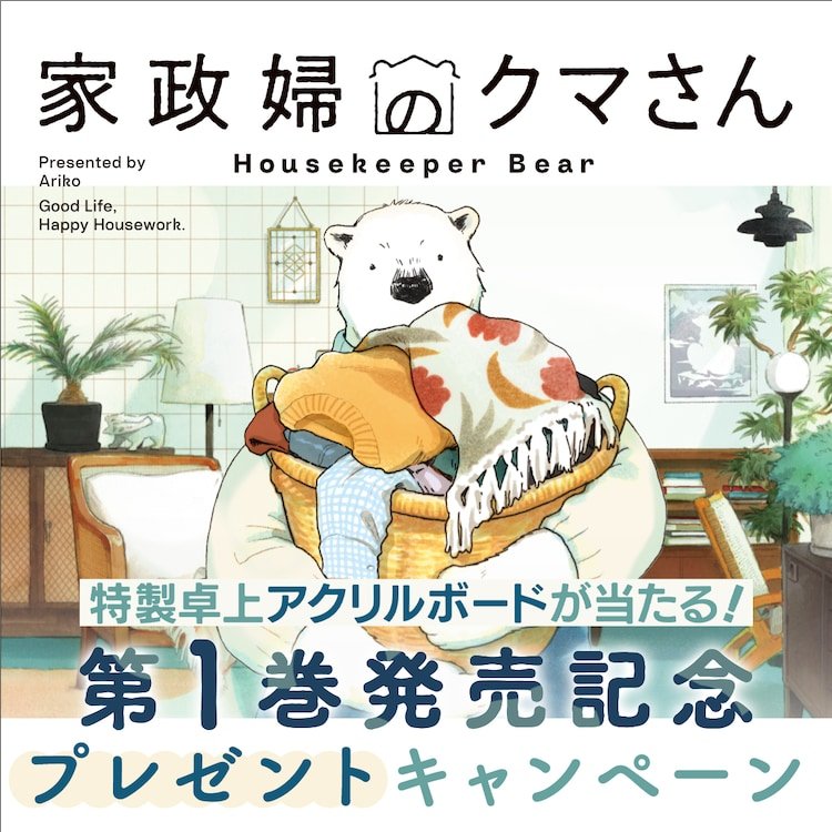蟻子创作的漫画《家政妇熊先生》第1卷正式发售。这是一部以经营家事代行服务的白熊先生为主角的生活群像剧。在喫茶ポーラー(北极熊咖啡馆),有一位提供家事代行服务的“...