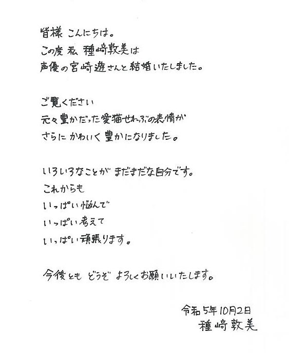 声优种崎敦美和宫崎游宣布结婚了。这是今天10月2日,在种崎敦美和宫崎游的X(旧Twitter)上报告的。种崎还同时上传了自己饲养的爱猫照片,并写道:“请看,原本...