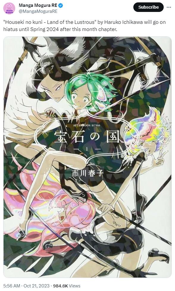 由市川春子创作的漫画《宝石之国》宣布本月更新后,将休刊至2024年春。漫画《宝石之国》在2012年12月讲谈社《月刊Afternoon》上开始连载,2020年1...