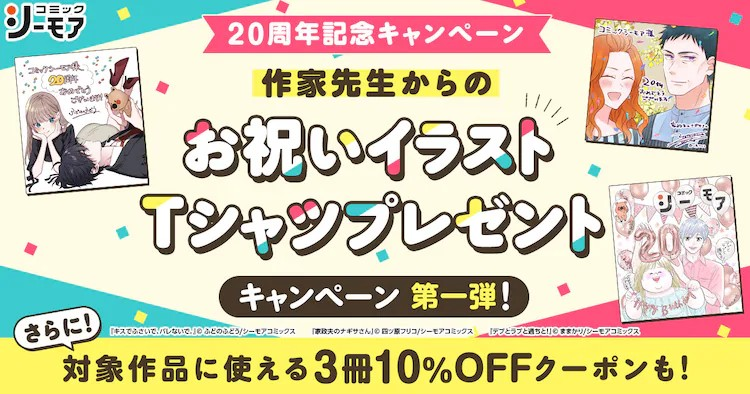 为庆祝漫画シーモア20周年,官方举办了一场特别的T恤抽奖活动。这些T恤上印有作家们为纪念20周年所绘制的插画。参与者只需关注漫画シーモア的官方X账...
