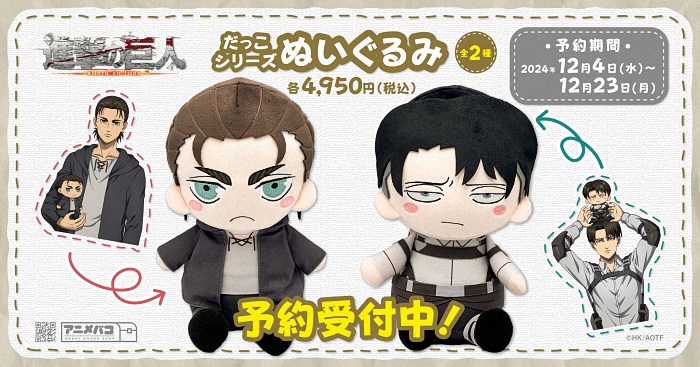 《进击的巨人》中的主角艾伦·耶格尔和利威尔兵长的新作布偶即将推出。这两款布偶分别定价为4,950日元(含税),预计将于2025年4月正式发售。布偶...